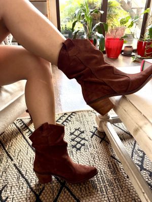 Confeccionada en un suave reno color chocolate, esta bota destaca por su silueta relajada y caña ligeramente drapeada, aporta un look autentico y lleno de personalidad.