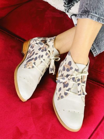 cordones: encerados color hueso con pompones cuero print en la punta