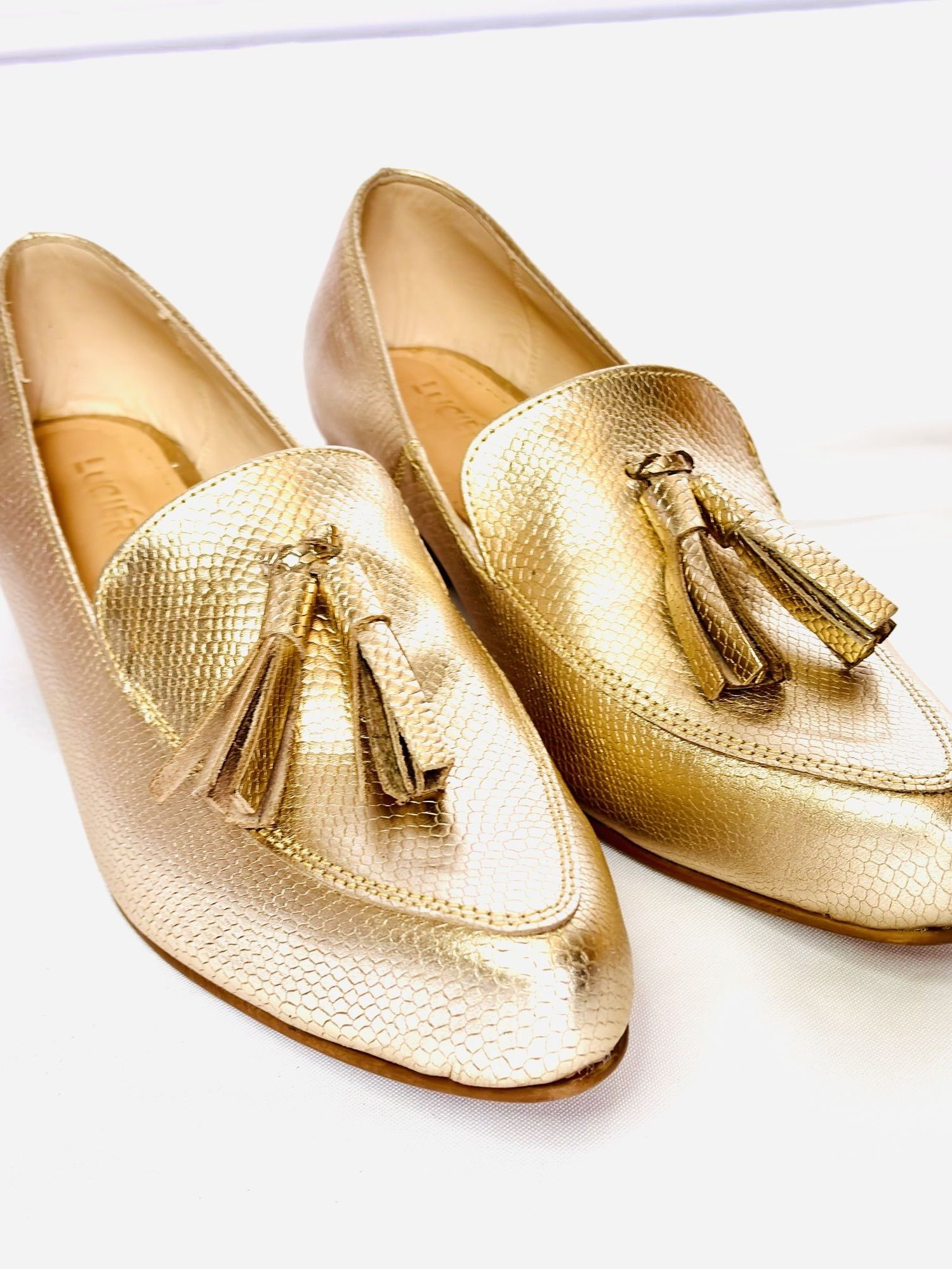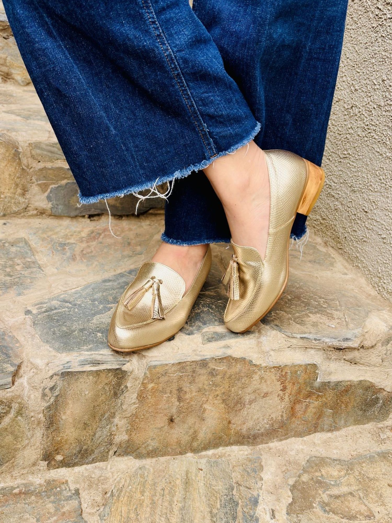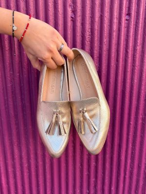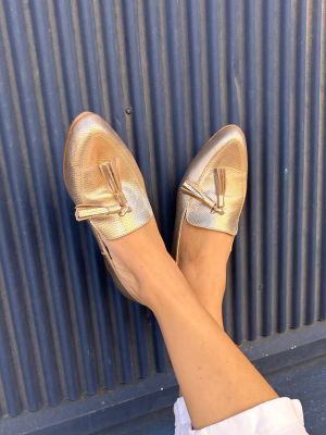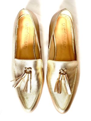 dorado 1.jpgNuestro mocasín dorado es la mezcla ideal entre estilo y comodidad. Diseñado en un acabado metalico que aporta luminosidad y modernidad, sus borlas de cuero aportan movimiento y fluidez a tu caminar.