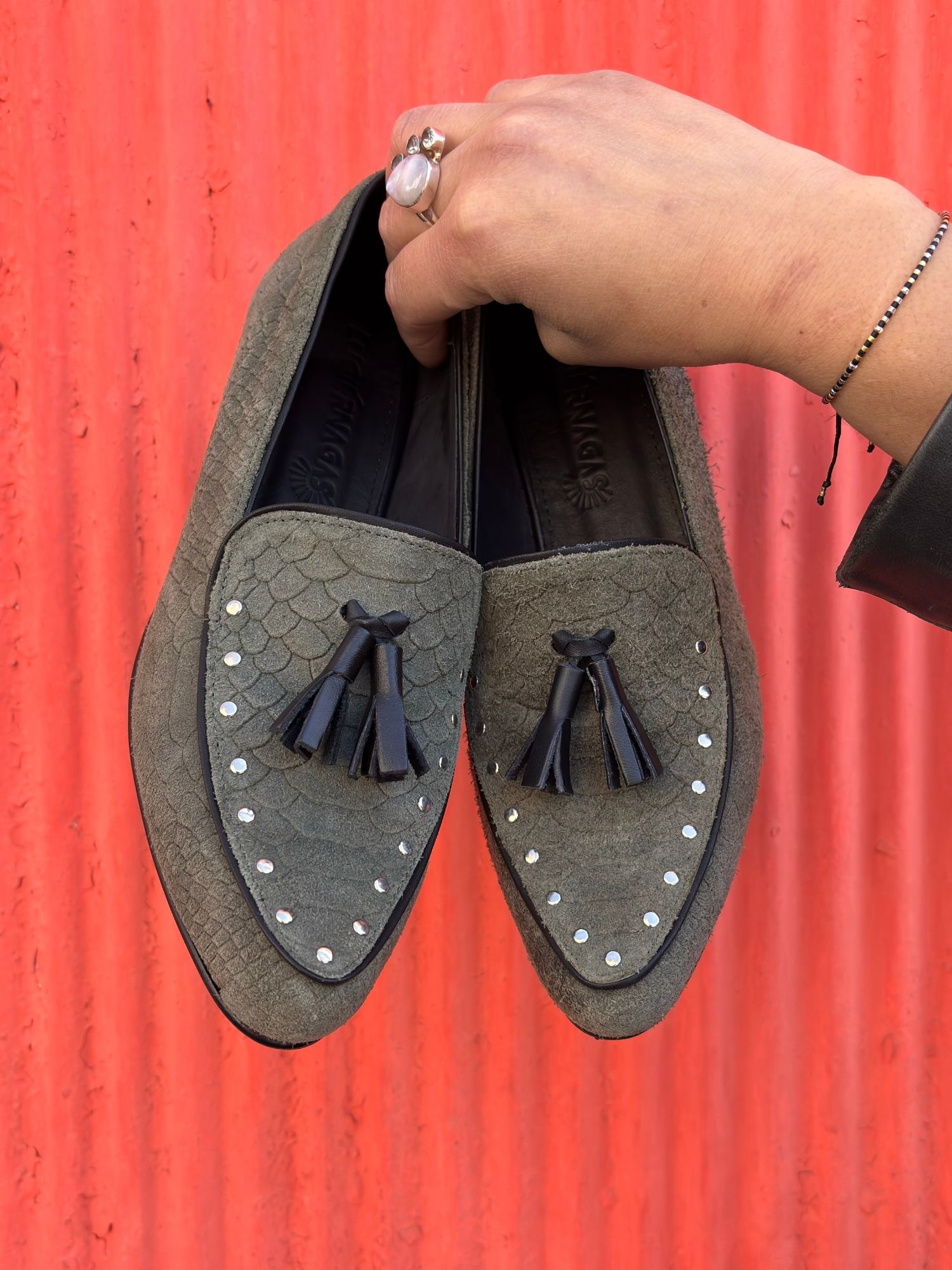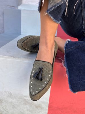 $76.500Este mocasín en tono verde musgo con acabado anaconda destaca por su estilo único y atrevido. Sus tachas plateadas aportan un aire moderno y rebelde, mientras que las borlas negras suman un detalle clásico que equilibra el diseño. Un calzado versátil que combina carácter y elegancia, ideal para quienes buscan diferenciarse con un accesorio cómodo, sofisticado y lleno de personalidad.